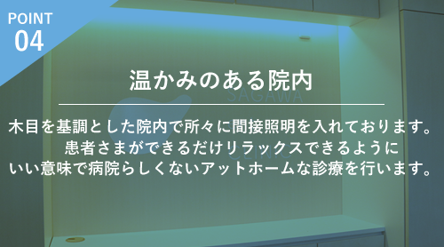 明るい清潔なクリニックで、確かな診断と分かりやすい説明で患者さん本位の治療を心がけております。